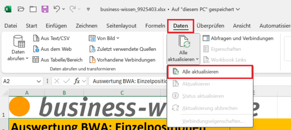 Um die jeweils aktuellen Dateien aus dem Importverzeichnis zu importieren, wählen Sie in der Excel-Vorlage für die Datenauswertung im Menü Daten > Registerkarte Abfrage & Verbindungen > Funktion Alle aktualisieren.