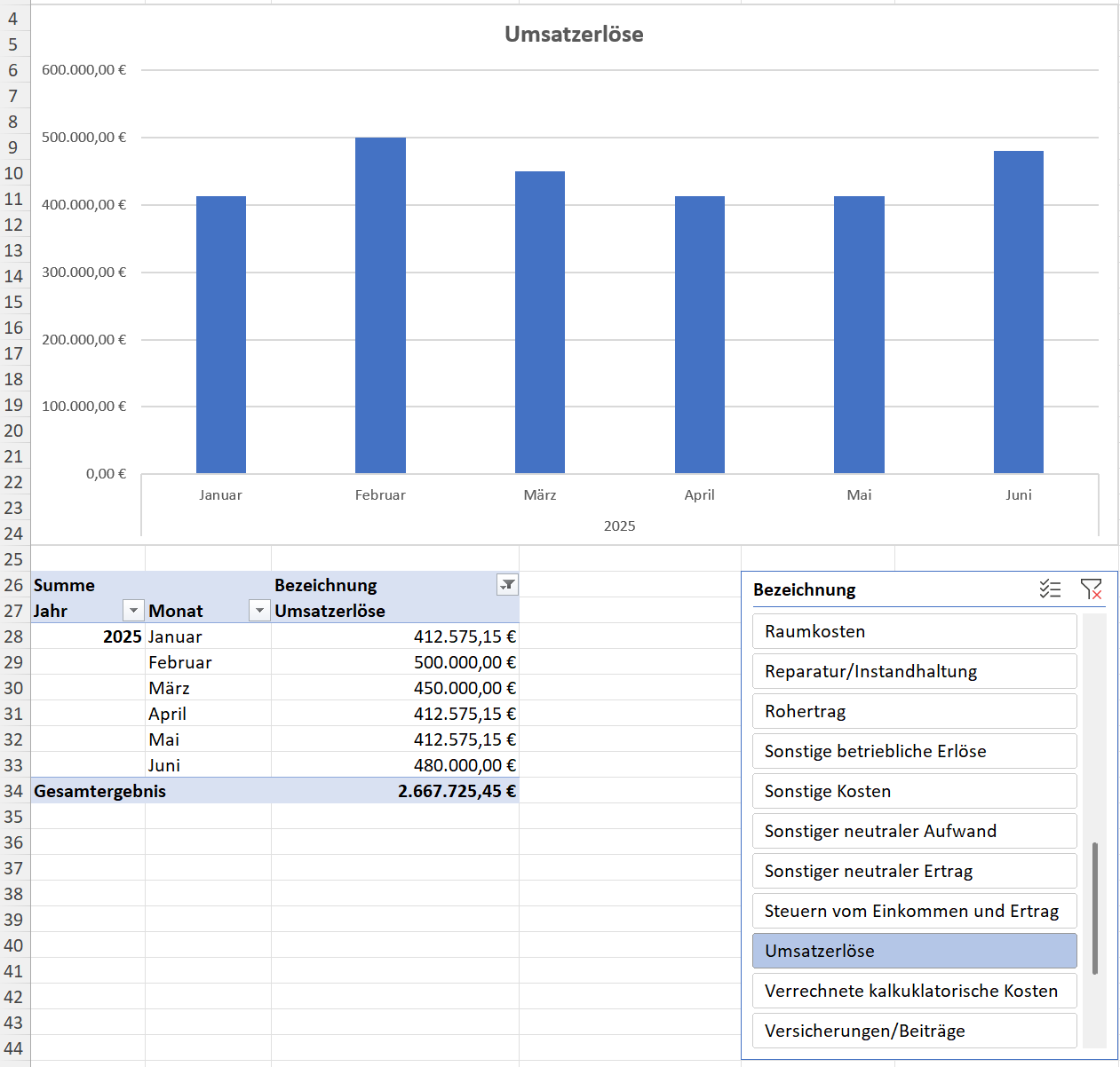 Mithilfe der Excel-Vorlage (siehe oben) können Sie nun eigene Berichte für die Analyse Ihrer BWA-Daten erstellt. Die Daten aus dem Power-Pivot-Datenmodell können dazu als Pivot-Tabellen und Pivot-Charts ausgewertet werden.