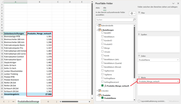 Ziehen Sie das neue Measure Produkt_Menge-verkauft in den Wertebereich einer Pivot-Tabelle. Es wird die Summe der Spalte Menge berechnet.