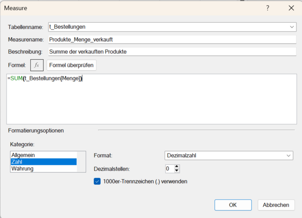 Als Nächstes vergeben Sie einen verständlichen Namen. Vergeben Sie einen klaren, beschreibenden Namen. Statt kryptischer Standardnamen wie „Summe von Menge“ können Sie das Measure „Produkt_Menge_verkauft“ eindeutig und nachvollziehbar nennen. In Pivot-Tabellen wissen Anwender dann sofort, was gemeint ist.