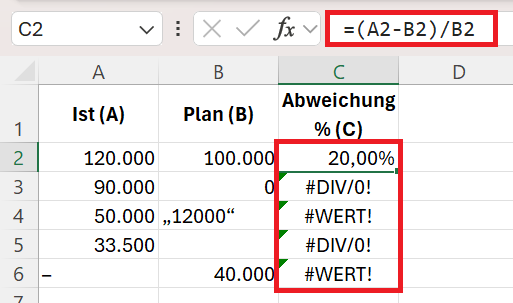 - Logikfehler: Der Klassiker beim Berechnen von prozentualen Abweichungen ist: =(A2-B2)/A2 statt: =(A2-B2)/B2.