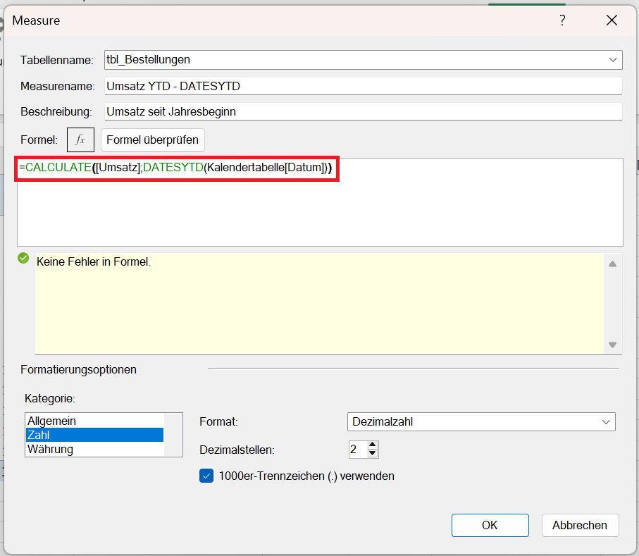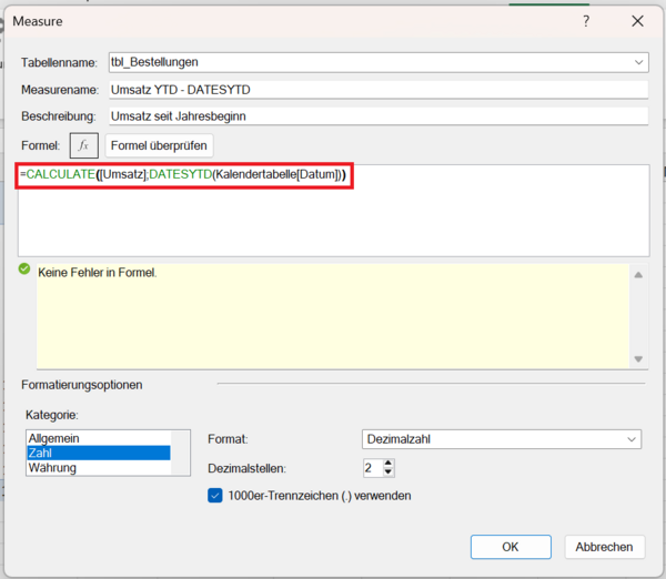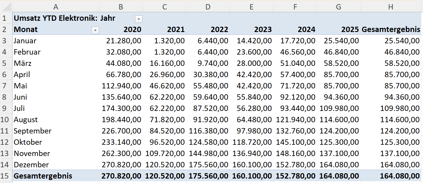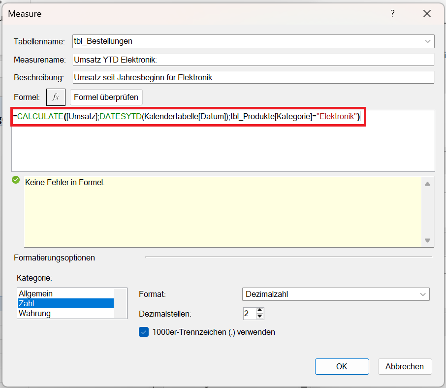 Umsatz YTD Elektronik :=CALCULATE([Umsatz]; DATESYTD(Kalendertabelle[Datum]); tbl_Produkte[Kategorie] = "Elektronik")