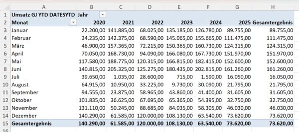 Damit startet die Berechnung automatisch am 1. Juli und läuft bis zum jeweils aktuellen Filterkontext. TOTALYTD könnte das zwar auch – aber DATESYTD erlaubt Ihnen, diese Logik flexibel in andere Formeln einzubauen.