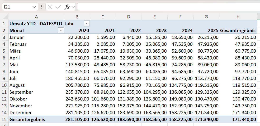 DATESYTD ist ein Baustein. Sie bekommen keine kumulierten Werte, sondern eine Tabelle mit allen Datumswerten vom Jahresanfang bis zum aktuellen Filterkontext. Diese Tabelle können Sie dann in Funktionen wie CALCULATE oder SUMX einsetzen, um Ihre eigene Berechnung aufzubauen.
