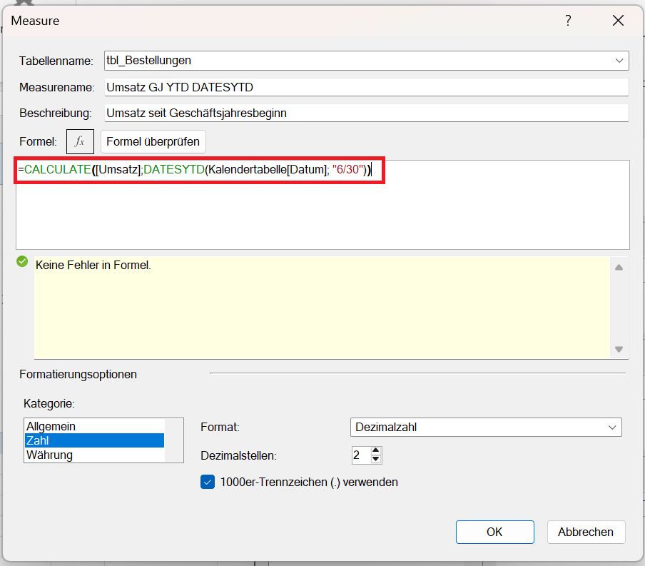 Umsatz GJ YTD :=CALCULATE([Umsatz];DATESYTD(Kalendertabelle[Datum]; "6/30"))