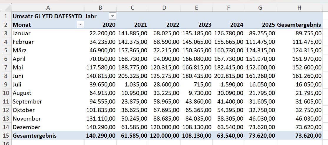 Mit der Funktion TOTALYTD können Sie schnell kumulierte Werte seit Jahresbeginn berechnen – zum Beispiel den Umsatz bis zum aktuellen Monat. TOTALYTD ist praktisch, weil es „alles in einem Schritt“ erfolgt.