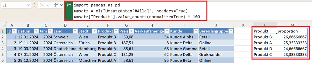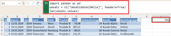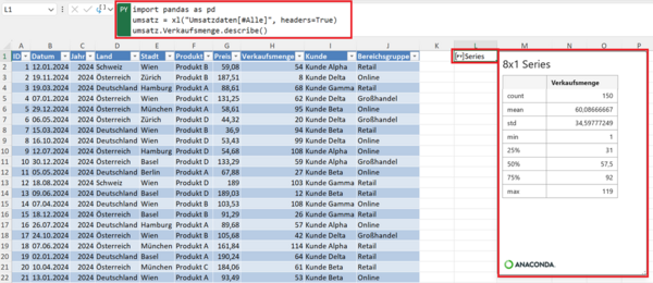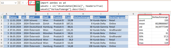 Diese Python-Analyse können Sie sich auch in das Excel-Blatt ausgeben lassen, um die Daten direkt mit Formeln weiterverarbeiten zu können.
