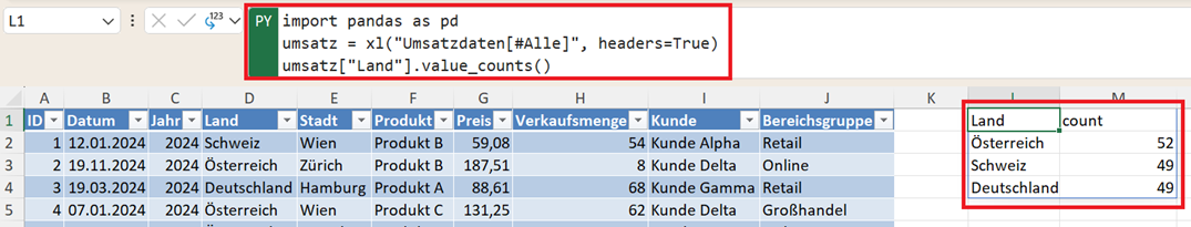 Sie sehen sofort: Die meisten Umsätze kommen aus Österreich – das ist eine wichtige Erkenntnis für regionale Analysen.