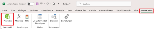 Aktivieren Sie im Menüband die Befehlsfolge Registerkarte Power Pivot > Befehlsgruppe Datenmodell > Befehl Verwalten.