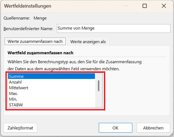 Die jeweiligen Measures wählen Sie aus, indem Sie den Eintrag im Wertebereich anklicken und die Funktion Wertfeldeinstellungen… wählen.