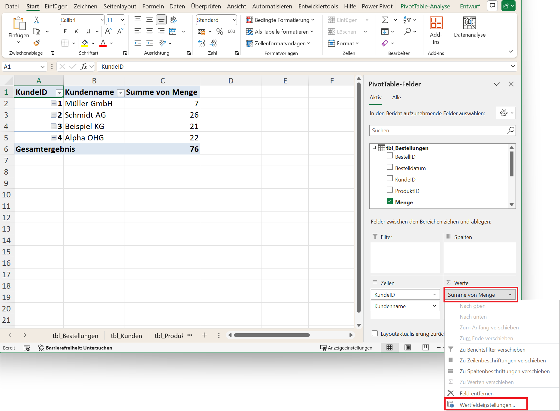 Jedes Mal, wenn Sie ein Feld in den Wertebereich ziehen und dort anpassen, legt Excel im Hintergrund ein implizites Measure mit der passenden Formel an.
