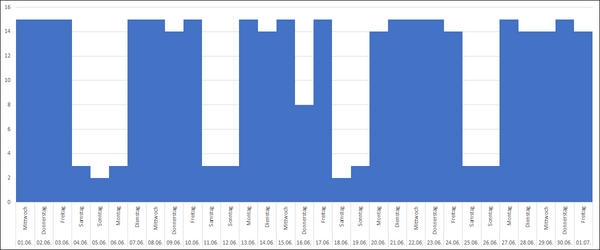 Für das vorgestellte Beispiel wären rund 20 Arbeitsplätze sinnvoll, die entsprechend ausgestattet sind und bei maximaler Besetzung, zum Beispiel Dienstag, vormittags im Januar, alle belegt wären. Zur Sicherheit könnten drei weitere Plätze vorgehalten werden, die als Puffer dienen.