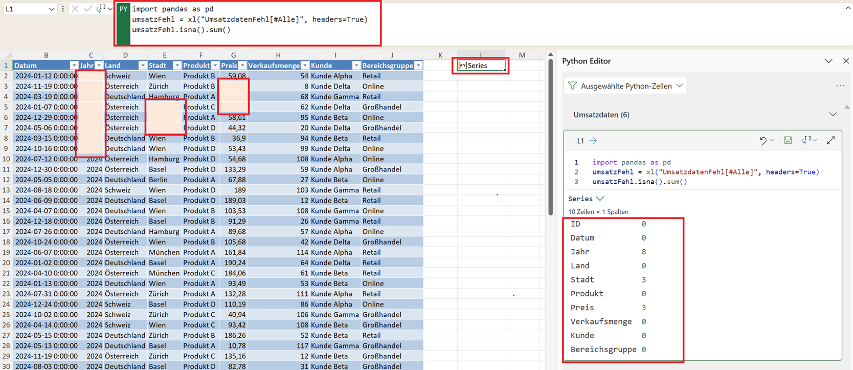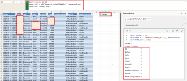 Alternativ funktioniert auch umsatz.isnull().sum() – beides ist identisch. Das Ergebnis ist eine Übersicht, wie viele Werte pro Spalte fehlen. Ein Beispiel könnte so aussehen: