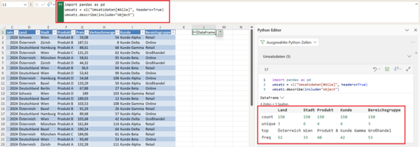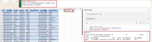 Python in Excel für die DatenanalyseKennzahlen der explorativen Datenanalyse mit Pandas