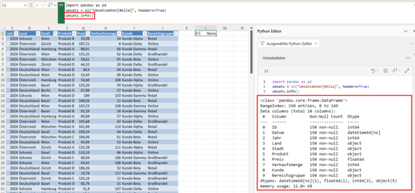 Angenommen, Ihr DataFrame heißt umsatz. Dann können Sie sich zunächst grundlegende Informationen über diesen Datensatz anzeigen lassen. Dazu verwenden Sie die Funktion info():