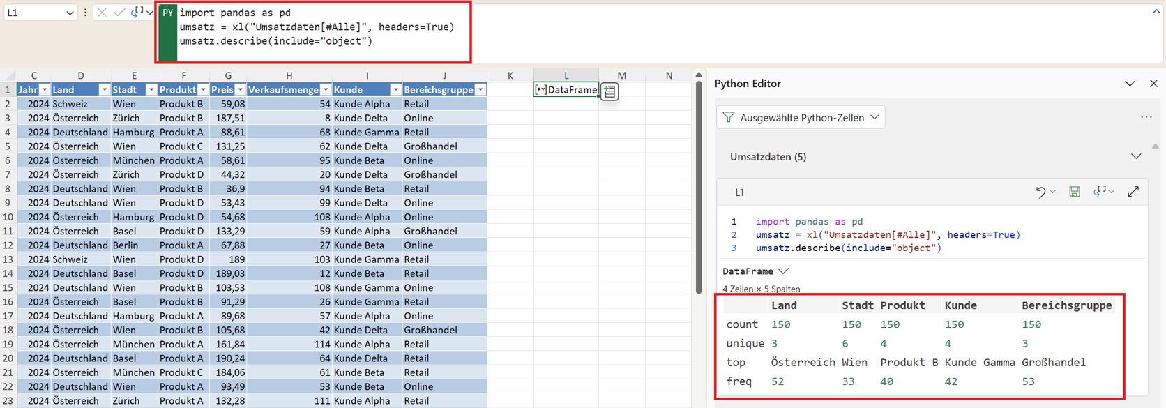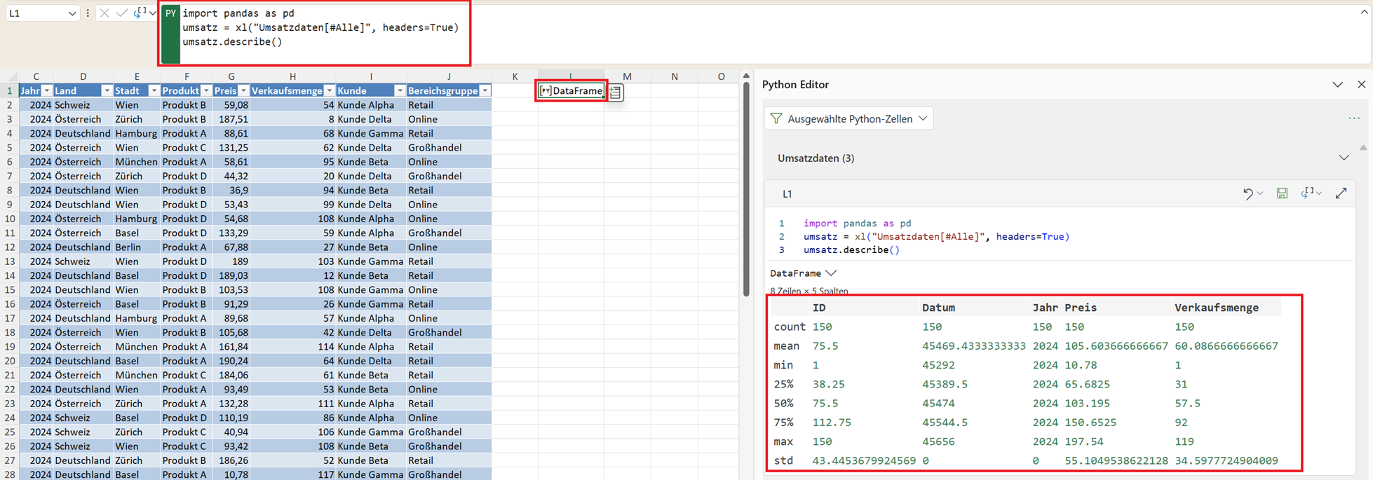 Viele dieser Kennzahlen sind auch in Excel verfügbar. Allerdings müssten sie dort meist einzeln berechnet werden. Mit describe() erhalten Sie dagegen eine komplette statistische Analyse auf einen Blick.