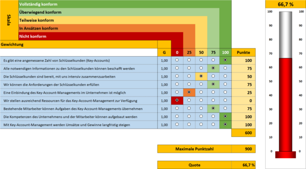 Fassen Sie die Ergebnisse der Entscheidungsvorlage in einer Übersicht zusammen, in der Sie bewerten, inwiefern die Voraussetzungen für ein Key-Account-Management erfüllt sind. Mit der Excel-Vorlage (siehe Praxisteil) können Sie eine Übersicht erstellen, wie sie in der folgenden Abbildung dargestellt ist.