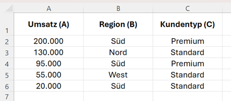 =WENN(UND(B2="Süd";A2>=100000;C2="Premium");"A+"; WENN(A2>=100000;"A"; WENN(A2>=50000;"B"; "C")))