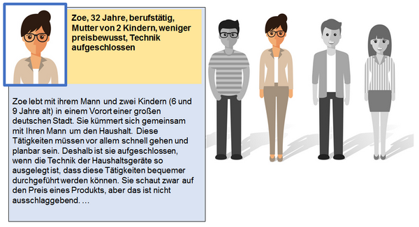 Die Kunden, ihre Merkmale, Charakteristika und Kaufmotive können mit dem sogenannten Persona-Konzept anschaulich dargestellt werden. Dazu wird eine fiktive Person benannt und beschrieben, die stellvertretend für die Kundengruppe oder Zielgruppe steht. Die folgende Abbildung zeigt ein Beispiel.
