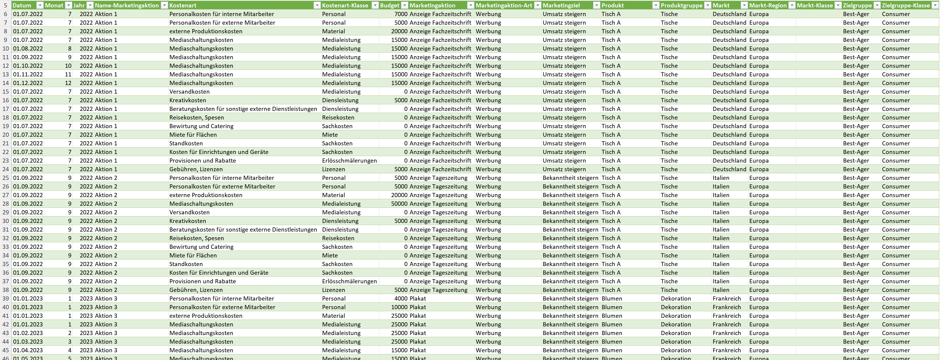 - sortierbare und filterbare Tabellen, die zum Beispiel beantworten: Mit welchen Marketingaktionen wird Zielgruppe X adressiert und wie viel kosten diese unser Unternehmen für das Jahr 2024 insgesamt?