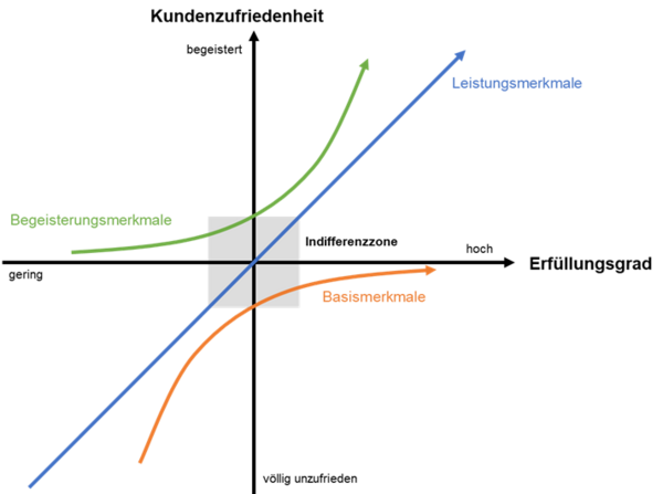 Zunächst werden auf der Grundlage der Kundenbewertung und der damit verknüpften Kundenzufriedenheit drei Kategorien für Merkmale, Eigenschaften und Leistungen eines Produkts oder einer Dienstleistung unterschieden: