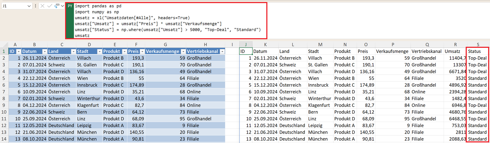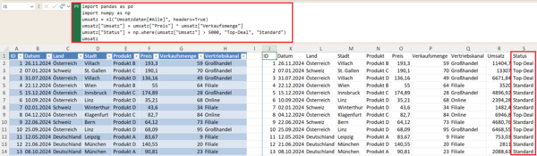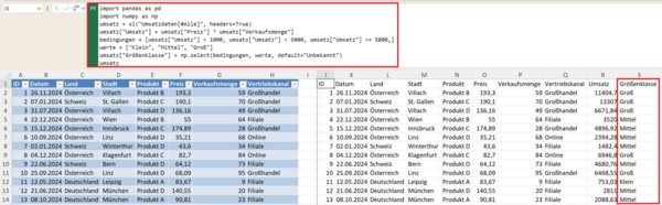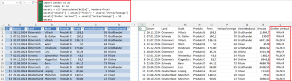 Wichtig: Für die folgenden Beispiele benötigen Sie die Bibliotheken Pandas und NumPy. In der Excel-Python-Umgebung (=PY) sind diese bereits verfügbar. Fügen Sie den Import dieser Bibliotheken einmalig ganz am Anfang Ihrer Python-Zelle ein: