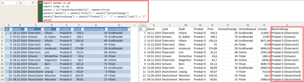 umsatz["Beschreibung"] = umsatz["Produkt"] + " (" + umsatz["Land"] + ")"