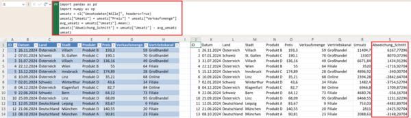 Sowie die Abweichung vom Durchschnitt als neue Spalte: