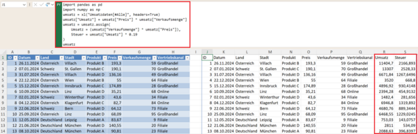 Das Geniale an Pandas: Sie müssen keine Formeln „ziehen“. Pandas rechnet vektorisiert – das heißt, die Operation wird automatisch auf jede Zeile angewendet.