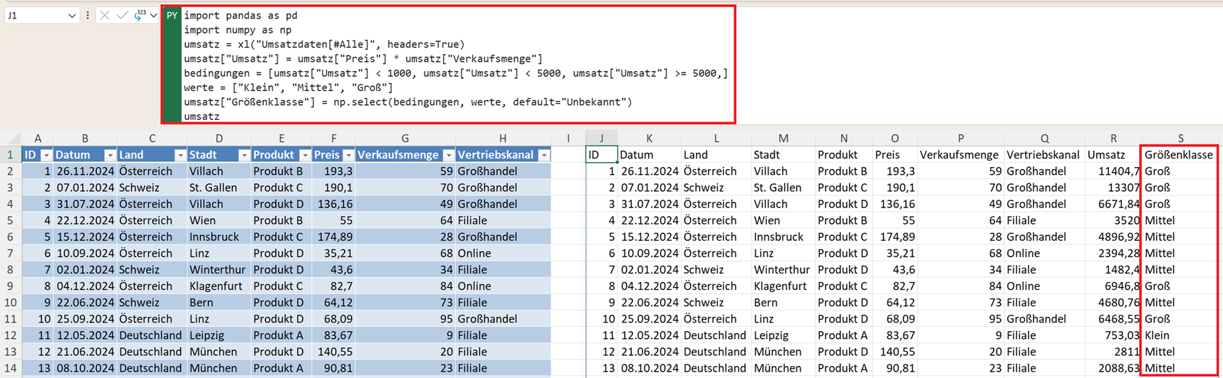 umsatz["Größenklasse"] = np.select(bedingungen, werte, default="Unbekannt")