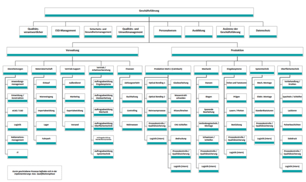 Mit Kästen, Kreisen, Pfeilen und Linien werden Zusammenhänge zwischen einzelnen Einheiten der Organisation, den Abteilungen und Mitarbeitenden dargestellt.