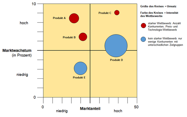 Die folgende Abbildung zeigt, wie ein Portfolio-Diagramm für das Produktsortiment eines Unternehmens aussehen kann.