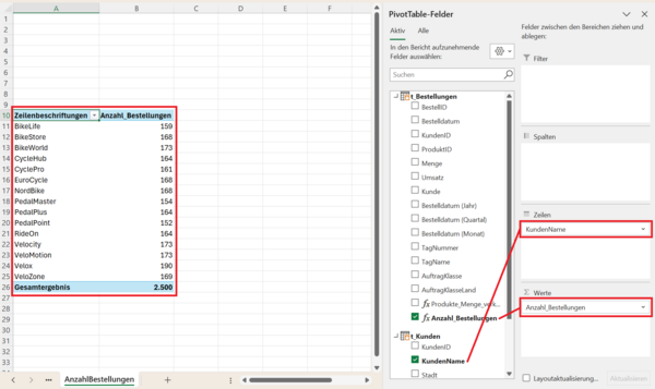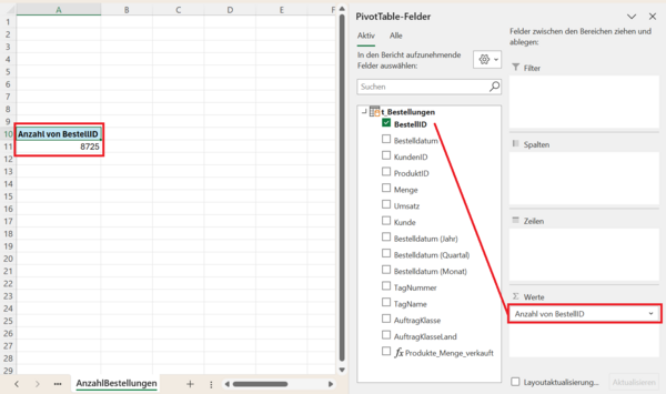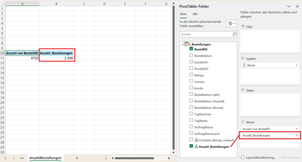 Ziehen Sie das neue Measure Anzahl_Bestellungen in den Wertebereich einer Pivot-Tabelle. Dann sehen Sie die korrekte Anzahl der Bestellungen – unabhängig davon, wie viele Bestellpositionen eine Bestellung umfasst.