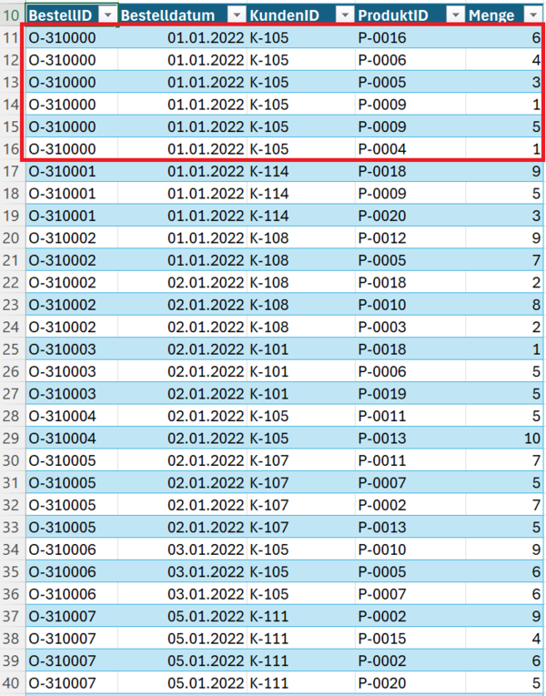 Beispiel: Die ersten 6 Zeilen enthalten dieselbe Bestell-ID – sie gehören also zur gleichen Bestellung. Das bedeutet: Die Anzahl der Zeilen in der Tabelle entspricht nicht der Anzahl der Bestellungen, sondern der Anzahl der Bestellpositionen.