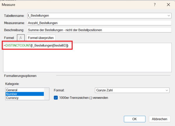 DISTINCTCOUNT ist die passende DAX-Funktion, um eindeutige Werte zu zählen. Im Unterschied zu COUNT zählt sie nur verschiedene Bestellnummern (BestellID), auch wenn diese mehrfach vorkommen.