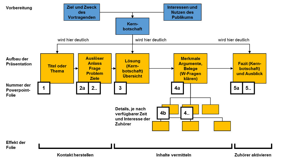 Die folgende Abbildung 1 zeigt die Struktur einer gut gegliederten Präsentation. Wie Sie diese Schritt für Schritt aufbauen, lesen Sie im folgenden Abschnitt des Handbuch-Kapitels sowie im Kapitel zu Präsentationsfolien.