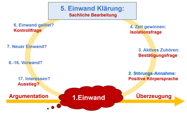 Unter psychologischen Aspekten ist vor allem darauf zu achten, dass unnötige Spannungen vermieden werden, die Verhandlung danach konstruktiv fortgeführt werden kann und Akzeptanz mit der Einwand-Klärung beim Gegenüber aufgebaut wird.