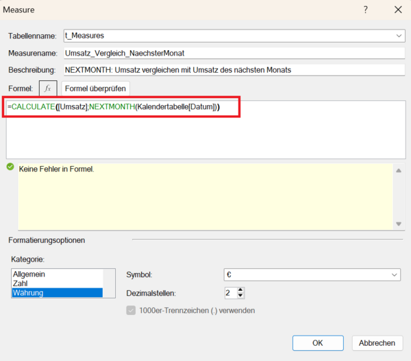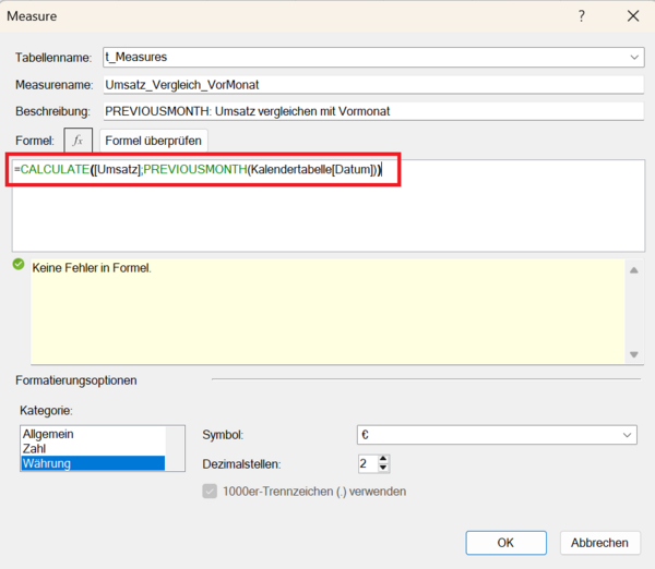 Umsatz Vormonat :=CALCULATE([Umsatz]; PREVIOUSMONTH(Kalendertabelle[Datum]))