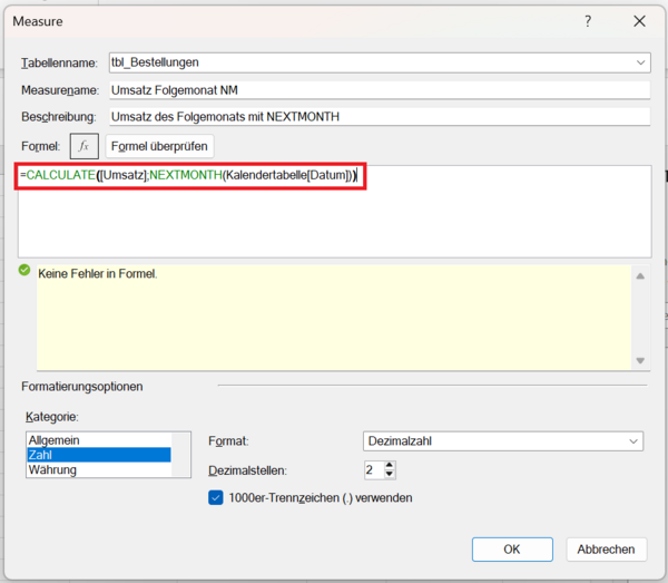 Umsatz Folgemonat :=CALCULATE([Umsatz]; NEXTMONTH(Kalendertabelle[Datum]))