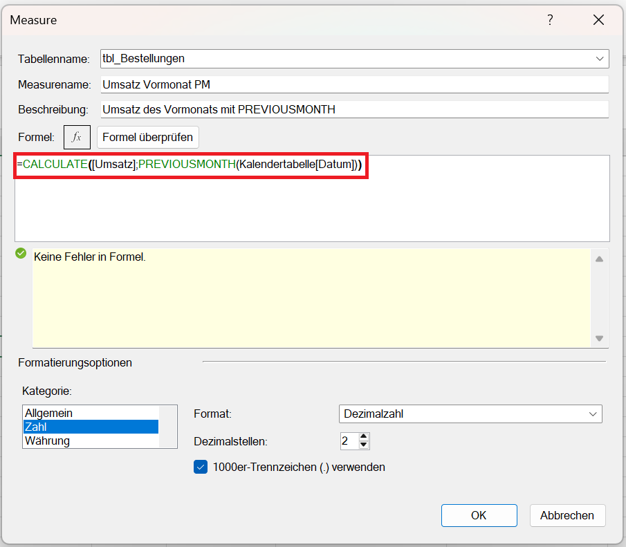 Umsatz Vormonat :=CALCULATE([Umsatz]; PREVIOUSMONTH(Kalendertabelle[Datum]))