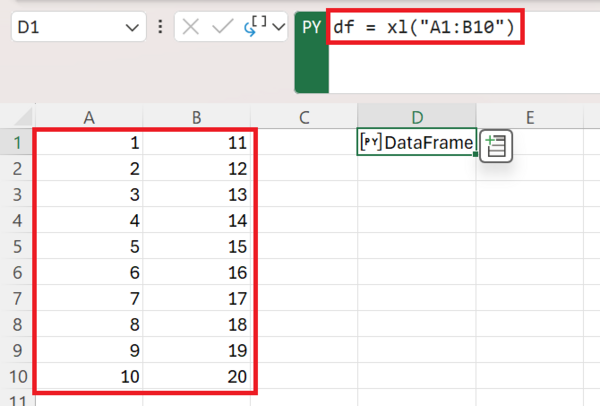 - df = xl("A1:B10") importiert den angegebenen Zellbereich in einen DataFrame.