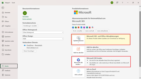 - Erneut unter der Registerkarte Datei > Befehl Konto prüfen, ob Sie im Beta-Channel registriert sind.
