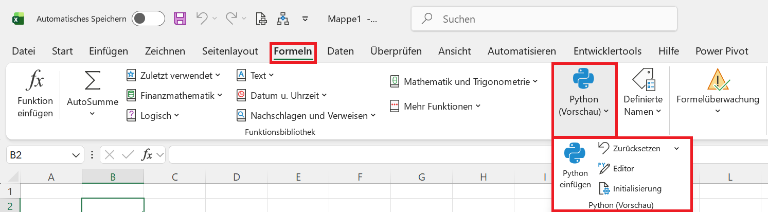 Nun sollte im Menüband unter Formeln das Symbol Python (Vorschau) erscheinen