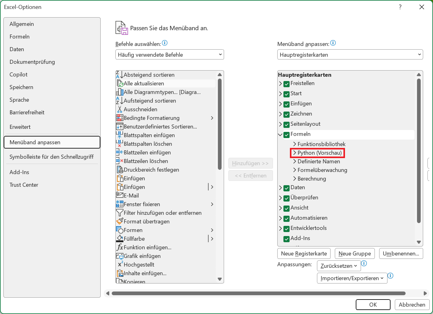 Es öffnet sich das Dialogfeld Excel-Optionen. Klicken Sie hier am linken Rand auf den Eintrag Menüband anpassen. Im rechten Bereich können Sie jetzt unter der Registerkarte Formel erkennen, ob Python vorhanden ist.