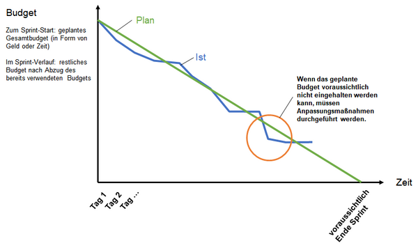 In einem Sprint-Burn-Down-Chart wird sichtbar gemacht, wie das Projekt voranschreitet. Dazu wird festgehalten, welche Ressourcen oder Arbeitszeiten bereits verbraucht wurden. Dieser Ist-Aufwand wird mit dem Plan-Aufwand verglichen und in einem Diagramm, dem Burn-Down-Chart bei Scrum, dargestellt.