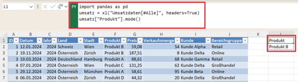 Neben Durchschnittswerten kann auch der häufigste Wert einer Spalte interessant sein. Diese Kennzahl nennt man Modus. Beispiel: häufigstes Produkt