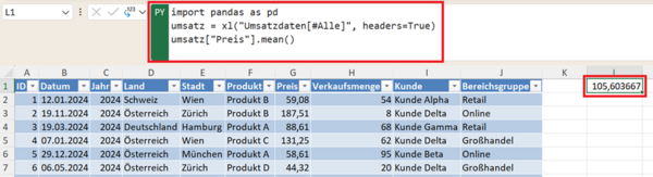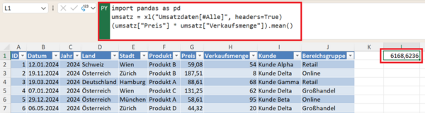 Das Ergebnis zeigt den durchschnittlichen Preis aller Transaktionen. Der Mittelwert ist eine der wichtigsten Kennzahlen in der Datenanalyse und wird häufig für erste Einschätzungen verwendet.
