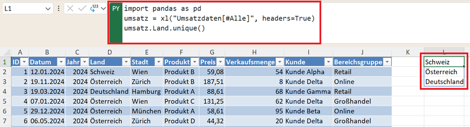 Das Ergebnis ist eine Liste aller einzigartigen Werte in dieser Spalte. Damit können Sie beispielsweise erkennen, in welchen Ländern Verkäufe stattgefunden haben.