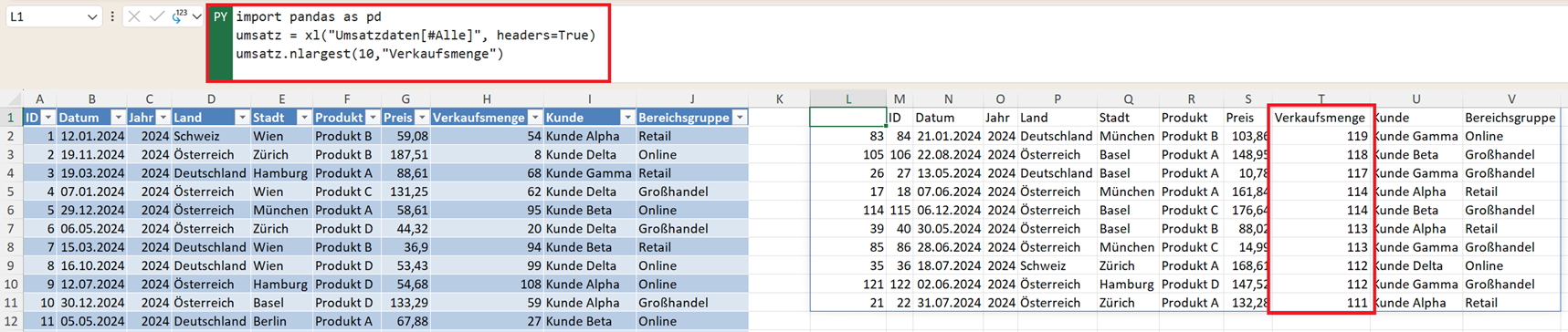 Eine weitere sehr hilfreiche Funktion ist nlargest(). Damit lassen sich die größten Werte einer Spalte schnell ermitteln. Beispiel: die zehn größten Transaktionen mit der höchsten Verkaufsmenge: