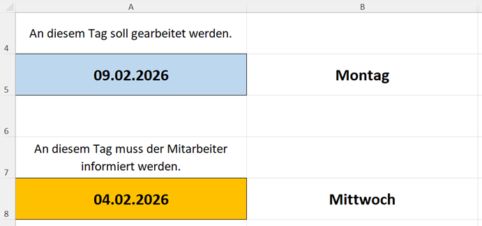- Der Zelle A8 entnehmen Sie, an welchem Tag die Mitarbeiterin oder der Mitarbeiter spätestens darüber informiert werden muss, dass sie am Tag aus Zelle A5 arbeiten soll.